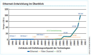 Ein weiterer Treiber für schnelleres Ethernet ist die Anbindung von Storage-Ressourcen an die Serverlandschaft über iSCSI. Zu Beginn unterstützte iSCSI dabei Geschwindigkeiten von 1 Gbit/s, was keine wirkliche Konkurrenz zur bislang meist im SAN eingesetzten Fibre-Channel-Technologie war. Denn deren Speichernetze ermöglichten Verbindungen mit 4 Gbit/s und später sogar 8 Gbit/s. Doch mit der Einführung von 10-Gigabit-Ethernet (10 GbE) fingen auch hier Veränderungen an (siehe Grafik). Denn jetzt spielen Netzwerkmanager zunehmend mit dem Gedanken, diese Technologie nicht nur für ihre LAN-Verbindungen, sondern auch für die Integ-ration von SAN-Verkehr (Storage Area Network) über dasselbe physikalische Ethernet-Netzwerk einzusetzen. Ein solcher Wechsel verringert dabei nicht nur die Zahl der physikalischen Verbindungen im Netzwerk. Er reduziert auch die allgemeine Komplexität sowie damit verbundene Kosten. Denn durch den Einsatz von iSCSI über Ethernet wird ein eigenes kostspieliges Fibre-Channel-Netzwerk überflüssig.