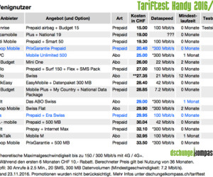 Der Wenignutzer tätigt monatlich 30 Anrufe, versendet 20 SMS und benötigt 300 MB Datenvolumen (Mindestgeschwindigkeit: 7,2 Mb/s). Das günstigste Angebot ist «Sunrise Prepaid airbag» mit der Option «Budget 15». Diese Option bietet monatlich 60 Anrufe bis zu 120 Minuten, 60 SMS und 400 MB Datenvolumen für den Pauschalbetrag von Fr. 15.–. Mit Fr. 19.– folgt auf Platz zwei das «Lycamobile»-Prepaid-Angebot mit der Option «National 19», welche für die Pauschale von Fr. 19.– 300 Minuten, 300 SMS und 500 MB Datenvolumen enthält