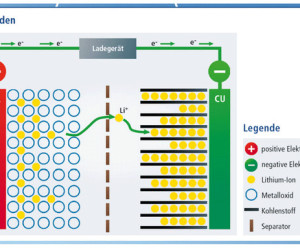 Beim Ladevorgang wird dem Akku Strom hinzugefügt. Dadurch findet an der positiven Aluminium-Elektrode eine Oxidation statt. Sie setzt Elektronen (e-) frei, die zur negativen Kupfer-Elektrode wandern. Es entsteht ein chemisches Ungleichgewicht. Die Lithium-Ionen (Li+) trennen sich deshalb vom Metalloxid und wandern durch den Separator. Auf der anderen Seite lagern sie sich zwischen den Kohlenstoffschichten ein.