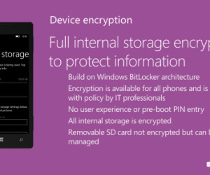 Verschlüsselung bei den mobilen Plattformen Windows Phone 8 kann zwar mittels Bitlocker den Telefonspeicher aber nicht die SD-Cards verschlüsseln. Diese Verschlüsselung kann zudem nur durch einen Administrator mittels ActiveSync-Richtlinie aktiviert werden.