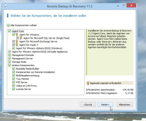 Wer sich bei der Installation von Acronis Backup & Recovery 11.5 (hier in der Version Advanced Workstation) für die manuelle Auswahl der Komponenten entscheidet, sieht bereits die vielen Möglichkeiten der Lösung.