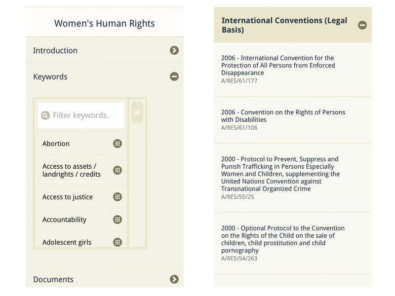 In einer EDA-App lassen sich nach Stichworten geordnet Informationen zu verschiedenen Frauenrechts-Themen suchen
