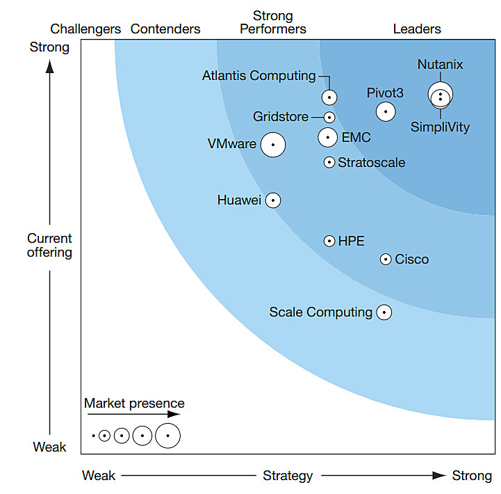 Nutanix ist zurzeit der grösste Anbieter von integrierten HCI-Appliances und bedient auch die meisten Kunden: mehr als 3'100 Firmen weltweit. Nutanix beschäftigt 1'800 Mitarbeitende in 80 Ländern. Die Analysten loben inbesondere die leichte Bedienbarkeit und das einfache Management der Lösungen. Den Jahresgewinn schätzt Forrester auf 200 Millionen US-Dollar. VMwares Konkurrenzprodukt VSAN (Virtual Storage Area Network) werde zwar häufiger verkauft, generiere aber insgesamt - nach Schätzungen von Forrester - geringere Erlöse. VMware reklamiert weltweit 4'000 VSAN-Kunden für sich und läuft auf Hardware unter anderem vom Cisco, Dell, HPE, Lenovo, Quanta und Supermicro. Der Vorteil: VMware ist Virtualisierungsmarktführer, und VSAN ist sehr gut in den restlichen VMware-Stack integriert. Ausserdem hat VMware die Funktionalität über die letzten drei Jahre kontinuierlich erweitert. SimpliVity hat mit seiner 'OmniStack-HCI-Lösung den Enterprise-Storage-Markt im Visier. OmniStack läuft auf Servern von Cisco, Dell oder Lenovo und eignet sich besonders für ICT-Landschaften mit vielen, voneinander getrennten Standpunkten (Multisite). Ein Flaschenhals ist bislang die oberste Grenze von 25 Knoten pro lokalem Cluster. Miteinander verknüpfte Cluster können aber bis maximal 1,3 PetaByte verwalten. Das dürfte für die meisten grösseren Unternehmen ausreichen. Pivot3 ist so etwas der Geheimtipp unter den HCI-Herstellern. Zwar liefert das Unternehmen bereits seit 2007 hyperkonvergente Infrastrukturlösungen aus, flog aber für die meisten potenziellen Kunden bislang unter dem Radar. Denn Pivot3 hatte sich auf Überwachungs- und Media-Speicher fokussiert. Der Anbieter hat weltweit 2000 Kunden. EMC gebietet über ein umfangreiches Portfolio hyperkonvergenter Lösungen, die zudem auf eigenen Patenten beruhen. Ein starkes Asset ist das Partnerunternehmen VMware mit seiner Storage-Appliance VxRail, einer Kombination aus x86-Servern, und VMware VSAN (Virtual Storage Area Network). . EMC selbst besetzt unter anderem mit VxRack den HCI-Markt. Hewlett Packard Enterprise (HPE) brachte im März dieses Jahres seine neue HC380 auf den Markt, eine Kombination aus eigenen ProLiant-DL380-Servern und StorageVirtual-IP-SAN-Technologie. Darauf hat HPE seine Management-Software OneView gesetzt. Die HC380 ist noch nicht lange auf Markt. Um fundierte Aussagen über Kundenadaption und Marktdurchdringung zu treffen, ist es daher noch früh. Wie die Konkurrentin HPE, so kam auch Cisco jüngst mit einem neuen HCI-Produkt auf den Markt: den HyperFlex Systems. Die Hyperflex-Systeme basieren auf lizensierter Software von Springpath und laufen auf Cisco UCS Servern. Zurzeit steckt die Lösung noch in einem frühen Stadium und offeriert nur Grundfunktionalitäten, fortgeschrittenere Features stehen aber auf der Roadmap. Einer der grössten Vorteile ist die tiefe Integration in Ciscos UCS-Management-Plattform. Huaweis HCI-Angebot FusionCube unterstützt mehrere HyperVisor, darunter VMware, denOpen-Source-HyperVisor KVM und die eigene proprietäre Lösung FusionSphere. Der FusionCube kam im Januar 2014 auf den Markt und scheint - so schreiben die Forrester-Analysten - ein technisch ausgereiftes und stabiles Produkt zu sein. Dafür spricht auch die Zertifizierung für SAPs Echtzeitplattform Hana. Für Hochleistungsszenarien unterstützt der FusionCube die Hochgeschwindigkeits-Übertragungstechnik Infiniband. Im Vergleich mit den Lösungen der Konkurrenz machen die Daten-Services allerdings einen schwachen Eindruck.