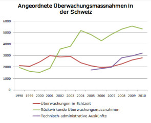Eine ähnliche Statistik kann auch auf der Webseite des EJPD abgerufen werden. Dort wird ersichtlich, dass im Jahr 2010 insgesamt 2798 «Überwachungen in Echtzeit» sowie 5330 «Rückwirkende Überwachungsmassnahmen» angeordnet wurden. Wie viele Massnahmen aktuell angeordnet sind, kann nicht gesagt werden, wie Guido Balmer, Sprecher des EJPD, ausführt. Hingegen stellt der Sprecher des EJPD klar, dass im Jahr 2010 von den 2798 Echtzeitüberwachungen nur in 20 Fällen der Internetzugang betroffen war. Der grosse Rest waren klassische Telefonüberwachungen. Eine Überwachung wird von Zwangsmassnahmengericht für 3 Monate bewilligt, nach Ablauf dieser Frist muss die Staatsanwaltschaft um Verlängerung ersuchen. Wie lange eine solche Massnahme durchschnittlich angewendet wird, ist dem zuständigen Dienst ÜPF nicht bekannt. Von solchen Massnahmen betroffene Personen müssen verdächtigt werden, Delikte nach Art 269 Abs. 2 STGB begangen zu haben. Des weiteren muss die Schwere der Straftat die Überwachung rechtfertigen und die bisherigen Ermittlungen müssen erfolglos geblieben sein. Bei den Delikten geht es etwa zur Hälte um schwere Widerhandlungen gegen das Betäubungsmittelgesetz, 20% betreffen qualifizierten Diebstahl. Der Rest wird wegen schweren Straftatbeständen, wie Delikten gegen Leib und Leben, gegen die sexuelle Integrität, wegen Pornographie, Mitgliedschaft in einer kriminellen Organisation, Vermögensdelikten sowie Menschenhandel angeordnet. In über 90% der Fälle wurden die Massnahmen von kantonalen Strafverfolgungsbehörden angeordnet.