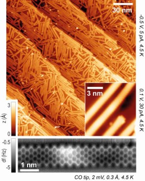 Nur wenige Atome breite Graphenbänder, sogenannte Graphen-Nanoribbons, haben spezielle elektrische Eigenschaften, die sie zu viel versprechenden Kandidaten für die Nanoelektronik der Zukunft machen: Während Graphen – eine nur ein Atom dünne, bienenwabenförmige Kohlenstoffschicht – ein leitendes Material ist, kann es in Form von Nanobändern zum Halbleiter werden. Das bedeutet, es hat eine genügend grosse Energie- oder Bandlücke, in der keine elektronischen Zustände möglich sind: Dadurch lässt es sich an- und abschalten – und wird so möglicherweise zu einem zentralen Bestandteil von Nanotransistoren.
