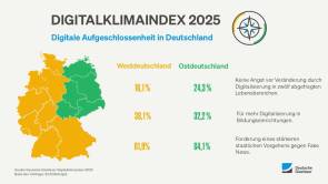 Auch bei der Frage nach der Rolle des Staates zeigen sich Unterschiede. 30,1 Prozent der Ostdeutschen erwarten stärkere gesetzliche Vorgaben für digitale Weiterbildung in Unternehmen, im Westen sind es 24,6 Prozent. Beim Kampf gegen Fake News und Hass im Netz fordern 64,1 Prozent der Ostdeutschen mehr staatliches Eingreifen, bei den Westdeutschen 61,9 Prozent.