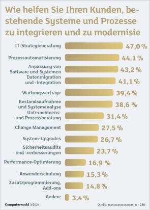 Die Integration und Modernisierung bestehender Systeme stellt eine weitere grosse Herausforderung dar, bei der Anbieter als zuverlässige Partner agieren können. Die Umfrage zeigt, dass 47,0 % der Unternehmen auf IT-Strategieberatung setzen, um die Digitalisierung ihrer Prozesse voranzutreiben. Prozessautomatisierung (44,1 %) und die Anpassung von Software und Systemen (43,2 %) sind ebenfalls entscheidende Massnahmen, um Effizienzgewinne zu erzielen und die Wettbewerbsfähigkeit zu steigern. Anbieter, die in diesen Bereichen Unterstützung bieten, können sich als unverzichtbare Partner für die digitale Transformation ihrer Kunden positionieren.