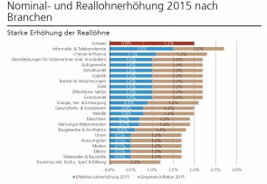 Grund für die gesunkenen Erwartungen ist hauptsächlich die Frankenstärke sowie der Entscheid der Schweizerischen Nationalbank, den Euromindestkurs aufzuheben. Um den negativen Folgen entgegenzuwirken, nehmen die meisten Unternehmen eine Margenreduktion vor, weichen auf ausländische Lieferanten aus oder bauen Arbeitsplätze ab, indem sie bei Fluktuationen freiwerdende Stellen nicht neu besetzen. Trotz dieser Prognosen muss keine Branche im Schnitt Lohnsenkungen erwarten – Einzelfälle kann es immer geben. Die durchschnittlichen Lohnerhöhungen werden aber 2016 in allen Branchen kleiner ausfallen als 2015. Dieses Jahr soll mit einer Reallohnerhöhung von zwei Prozent abschliessen, weil stark gefallene Energiepreise und die Aufhebung des EURCHF-Mindestkurses zu einer negativen Teuerung von 1,2 Prozent führen, sagt die UBS.