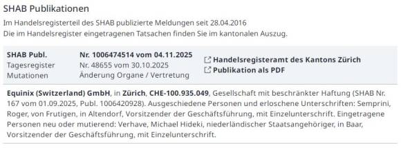 Im Zefix ist zu sehen, dass der Austritt von Semprini im Handelsregister bereits vollzogen ist. Neu wurde Michael Verhave von Equinix als Vorsitzender der Geschäftsführung eingetragen.