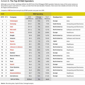 Roche vertritt die Schweiz mit 10,8 Mrd. US-Dollar an F&E-Investitionen auf Platz fünf. Als zweites eidgenössisches Unternehmen unter den Top 10 landet Novartis mit 9,1 Milliarden Dollar auf Platz neun. «Schweizer Pharma-Unternehmen haben ihre F&E-Budgets relativ zum Umsatz zwar weiter gesteigert, gleichzeitig ist der Umsatz jedoch leicht rückläufig gewesen. Die Frankenstärke und die getrübten wirtschaftlichen Aussichten wichtiger Exportmärkte führen zudem zu rückläufigen Schweizer F&E-Budgets im Industrie- und Elektroniksektor», sagt Alex Koster, Geschäftsführer von Strategy& in der Schweiz, über die Entwicklung.