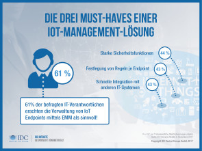Mobile Technologien werden in den nächsten zwölf Monaten dafür eingesetzt, die Fachbereiche - und zwar auch die sogenannten Blue-Collar-Bereiche wie Instandhaltung oder Logistik - durch Smart Devices und Apps besser zu unterstützen und deren Geschäftsprozesse zu mobilisieren. Gleichzeitig zählen die von IDC befragten IT-Verantwortlichen die Sicherstellung der Mobile Security und Compliance zu ihren Top-Prioritäten. Neue Mobility-Projekte entstehen ausserdem durch die EU-Datenschutz-Grundverordnung, auf die die Unternehmen sich vorbereiten. Angesichts der breiten Anforderungspalette ist die Umstellung auf eine Unified Endpoint Management Lösung für die Mehrheit der deutschen Unternehmen ein logischer nächster Schritt, um Tools und Teams bei gleichzeitiger Vereinfachung zusammen zu führen.