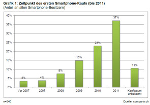 «Die vielseitigen Funktionen des Smartphones überzeugen offenbar immer mehr Leute», sagt Ralf Beyeler, Telecom-Experte von Comparis.ch, als Erklärung für die enorme Verbreitung. Mit dem Eintritt von Apple in den Schweizer Markt Mitte 2008 setzte die Ausbreitung in vollen Zügen ein. Seither steigt die Kurve steil an (vgl. Grafik 1): 23 Prozent der Smartphone-Besitzer haben ihr erstes Smartphone im Jahr 2010 gekauft, 37 Prozent im Jahr 2011. Mit anderen Worten: 60 Prozent und damit die weitaus meisten Smartphone-Nutzer haben ihr erstes Gerät erst in diesen zwei Jahren angeschafft.