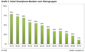 2,9 Millionen Schweizer oder rund 48 Prozent besitzen ein iPhone oder ein anderes Smartphone. Bei den jungen Erwachsenen sind es sogar rund vier von fünf Personen.