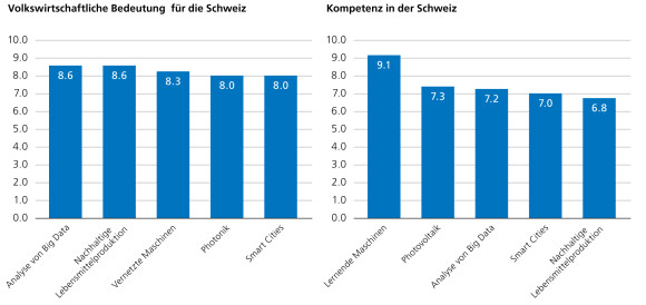 Das Potenzial der analysierten Technologien wurde im Rahmen der Untersuchung auf einer Skala mit insgesamt zehn möglichen Punkten bewertet. Big-Data-Analytics schafft es dabei an die Spitze – auf dieselbe Punktzahl kommt auch die nachhaltige Lebensmittelproduktion. Beurteilt wurde von den Fachleuten auch die hierzulande vorhandene Kompetenz hinsichtlich der jeweiligen Technologien. Hierbei attestieren sie der Schweiz hohes Know-how mit lernenden Maschinen, Photovoltaik und der Analyse von Big Data.