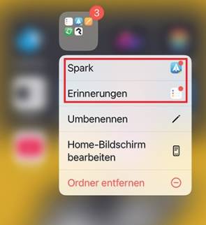 Doch diese Frage ist schnell geklärt: Drücken Sie etwas länger auf das Ordner-Symbol, bis ein Einblendmenü erscheint. Jetzt werden die nach Aufmerksamkeit buhlenden Apps angezeigt, im unten gezeigten Fall also Spark und Erinnerungen.