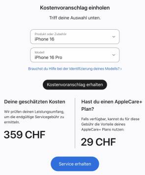 Ein konkretes Beispiel: Sie kaufen das Basismodell des iPhone 16 Pro für 1049 Franken und zahlen Fr. 14.90 monatlich für die Versicherung. Nach zwei Jahren haben Sie bereits Fr. 357.60 an Prämien bezahlt. Kommt es zu einem Displayschaden, kostet die Reparatur laut Apple-Website geschätzt 359 Franken, Bild 1. Ihre Versicherung beinhaltet einen Selbstbehalt von 100 Franken. Das ergibt am Ende also Fr. 457.60 an Versicherungsgebühren und Selbstbehalt. Ohne Versicherung hätten Sie fast 100 Franken gespart.