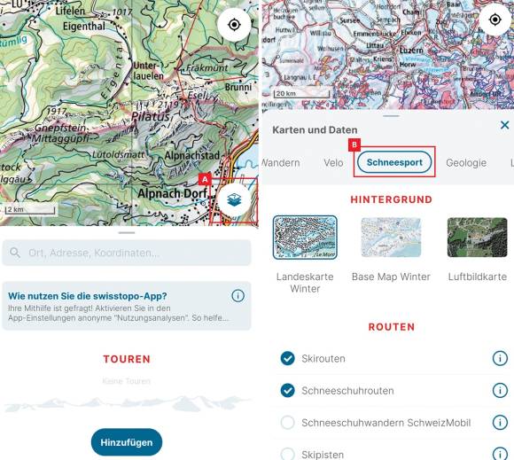 Bild 2: Die Schneesportkarten B finden Sie mit einem Klick auf das Karten-Icon A