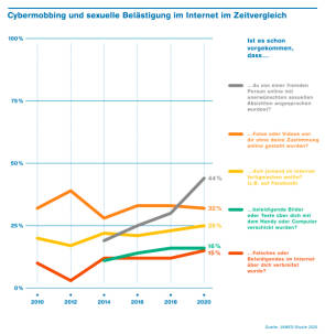 Noch häufiger als von Cybermobbing sind Jugendliche von sexuellen Belästigungen im Internet betroffen: Beinahe die Hälfte aller Jugendlichen (44 Prozent) wurde im Internet bereits einmal von einer fremden Person mit unerwünschten sexuellen Absichten kontaktiert. Seit 2014 ist diese Zahl deutlich angestiegen (2014: 19 Prozent). Mädchen sind davon häufiger betroffen als Jungen (55 Prozent vs. 28 Prozent).