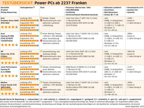 Bei den Grafikkarten wird ebenfalls geklotzt. Das Schnellste ist gerade gut genug: Der Acer- und Joule-Performance-PC sind mit einer Nvidia Geforce RTX 5070 respektive 5070 Ti bestückt. Bei den Tower-PCs von Asus, Medion und HP kommt sogar das hochwertigere Geforce-RTX-5080-Modell mit einem 16 GB grossen separaten Videospeicher zum Einsatz. Die Faustregel: Je höher die Modellnummer, desto schneller ist der 3D-Chip und desto mehr Recheneinheiten sind im Chip freigeschaltet, was wiederum für mehr 3D-Leistung in aktuellen Spielen sorgt.