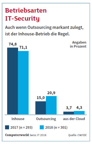 Der Trend zeigt sich auch in der Swiss-IT-Studie von Computerworld und IDC, bei der IT-Verantwortliche aus Schweizer Unternehmen auch nach der Betriebsart von IT-Lösungen befragt wurden. Beim Thema IT-Security gaben 20,9 Prozent an, diese im Outsourcing zu betreiben. Zum Vergleich: Vor einem Jahr noch gaben 15 Prozent der Befragten an, bei der IT-Sicherheit auf externe Hilfe zu setzen. Das ist eine doch signifikante Zunahme von knapp 6 Prozentpunkten. Auch der Bezug der IT-Security aus der Cloud steigt, wenn auch in bescheidenerem Ausmass. Lag der Anteil in unserer Umfrage von 2017 noch bei 3,7 Prozent, gaben heuer 4,3 Prozent an, IT-Sicherheit aus der Cloud zu beziehen.