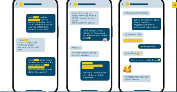 Als Zahlungsmittel werden meist direkte Überweisungsarten wie TWINT oder Banküberweisung verlangt. Nach der Zahlung bricht der Kontakt abrupt ab, Nachrichten bleiben unbeantwortet und die versprochene Ware trifft nie ein.