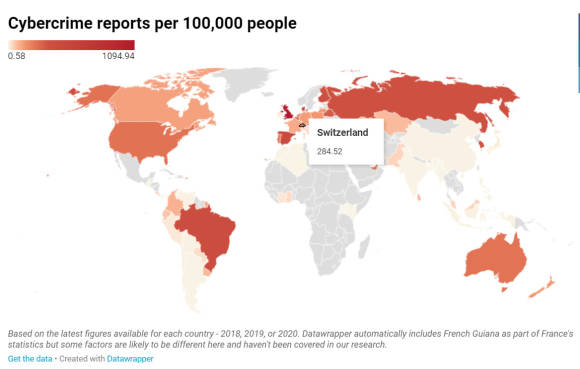 Weltweit werden zudem 71,1 Millionen Personen von Hackern angegriffen. Comparitech kommt somit auf fast 900 Opfer auf 100'000 Einwohner weltweit. In der Schweiz ist diese Zahl um einiges höher: Hier geht die Studie von knapp 1900 Fällen je 100'000 Einwohner aus, davon wurden gut 284 auch gemeldet (vgl. Grafik).