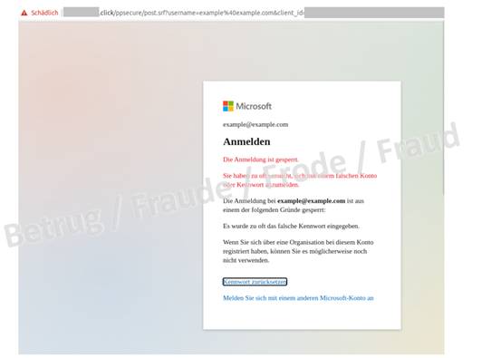 Sperrmeldung im gefälschten Microsoft-Office-365-Anmeldefenster