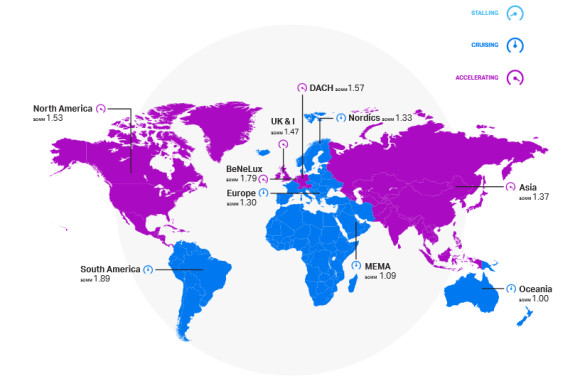 Auch regionale Unterschiede sind ersichtlich. So schneidet Südamerika am besten ab und erreicht einen aggregierten Wert von 1,89, gefolgt von den die Benelux-Ländern mit 1,79. Die DACH-Region (Deutschland, Österreich und Schweiz) landet auf Platz drei mit einem Wert von 1,57.