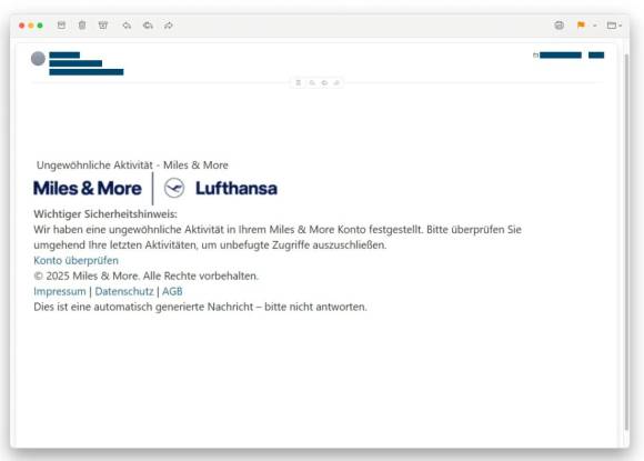 Die Phishing-Mail wirkt offiziell und enthält Logos von Miles & More und Lufthansa. Sie warnt vor angeblich ungewöhnlichen Aktivitäten im Konto und fordert dazu auf, die letzten Aktivitäten über einen Link zu überprüfen.