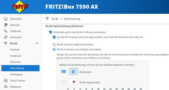Bild 11: Sofern das Kind nicht auf mobile Daten ausweichen kann, lässt sich das WLAN in der Fritz!Box auch zeitgesteuert betreiben
