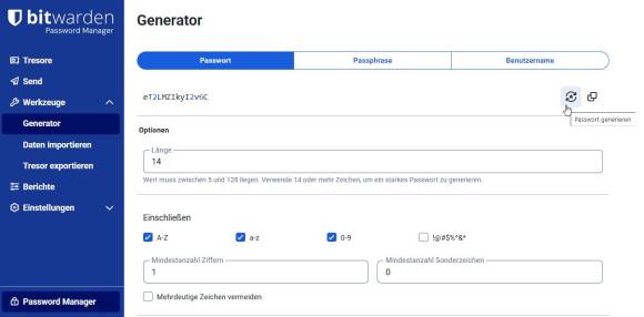 Bild 3: Bitwarden bietet einen internen Passwortgenerator für besonders sichere Passwörter, die in der Länge veränderbar sind