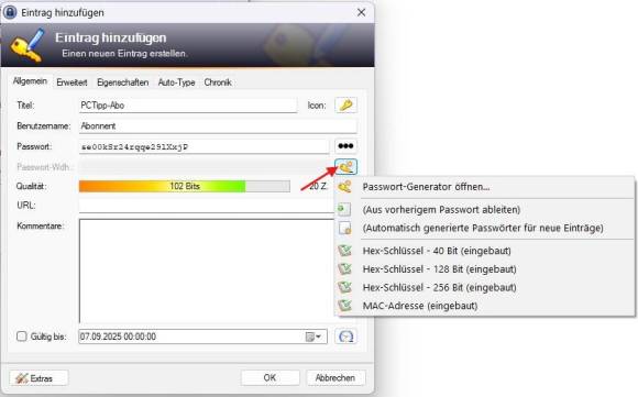 Bild 10: Bei einem neuen Passworteintrag lässt sich das Passwort auch via Schlüssel-Symbol erstellen