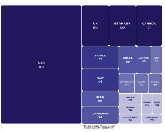 Die ausgewerteten Daten der Leak-Seiten zeigt, dass die Ransomware-Banden massenhaft Organisationen in den USA angegriffen haben. Mit 1118 Fällen kamen 42 Prozent der betroffenen Unternehmen aus den Vereinigten Staaten. Auf Platz zwei folgt das Vereinigte Königreich (130 Fälle), dicht gefolgt von Deutschland (129 Fälle). Auch die Schweiz taucht in der Liste, mit 36 Fällen, vergleichsweise weit oben auf. Generell kann gesagt werden, dass nach der Region Nordamerika vor allem Europa stark unter den Ransomware-Attacken leidet. Hierbei könnte das oben erwähnte «big-game-hunting» eine Rolle spielen, da viele der grössten internationalen Unternehmen in Nordamerika und Europa angesiedelt sind.