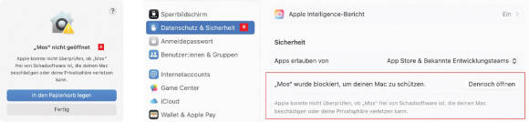 Einer nicht überprüften App wird der Start verweigert; doch mit einem Besuch in den Systemeinstellungen lässt sich das schnell korrigieren