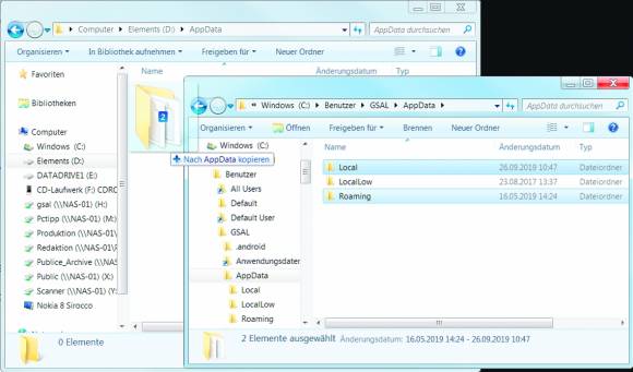 Damit finden Sie immer in den AppData-Ordner, auch wenn dieser normalerweise versteckt ist. Sie landen in einem Ordner wie C:\Users\IhrName\AppData und sehen darin im Normalfall die drei Ordner Local, LocalLow und Roaming. Kopieren Sie die beiden Ordner Local und Roaming in den vorhin auf der USB-Platte erstellten Ordner AppData, Bild 12. Der Grund: Ein Teil der Programmeinstellungen liegt im Unterordner Local, ein anderer Teil im Unterordner Roaming. Wenn Sie die Ordner öffnen, entdecken Sie darin weitere Unterordner, die meist pro Hersteller oder Programmname angeschrieben sind, etwa Adobe, Google, Hewlett Packard, Microsoft, Mozilla etc.