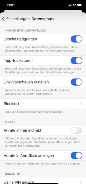 Wie bei Threema lässt sich auch bei Signal alles ausschalten, worauf ein Chat-Partner schauen könnte: Tipp-Indikatoren, Lesebestätigungen, Online-Status.