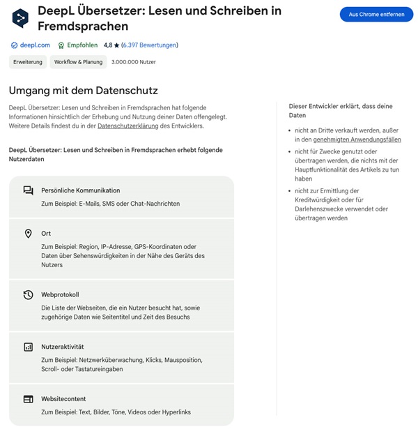 Ein Add-on, das den gesamten Inhalt einer Webseite übersetzen soll, muss diesen Inhalt auch lesen können. Entsprechend geben Sie einem Übersetzer ziemlich viel Zugriff auf Ihr Surfverhalten. Überlegen Sie also gut, welchem Anbieter Sie dieses Vertrauen entgegenbringen. Grosse Software-Hersteller werden besser kontrolliert und haben wenig Interesse an einem Datenskandal. Auf der anderen Seite sind Ein-Personen-Projekte zu klein, um Ihre spezifischen Daten abzugreifen, wobei hier allerdings automatisierte Prozesse aushelfen können. Open-Source-Projekte sind besonders empfehlenswert, da Sie Einsicht in den Code des Add-ons haben. Und falls Sie nichts davon verstehen, haben andere User die gleichen Möglichkeiten und können auffälliges Verhalten frühzeitig erkennen.