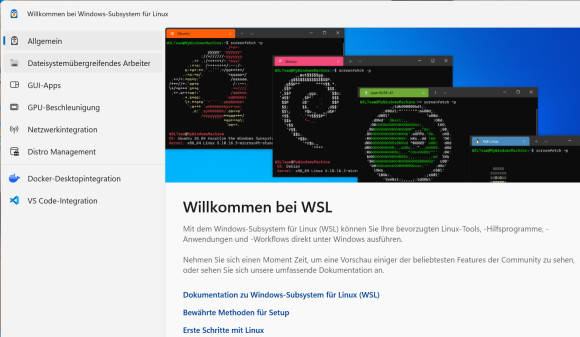 Unter Windows 11 öffnet sich anschliessend das Fenster mit dem Titel Willkommen bei Windows-Subsystem für Linux, Bild 4. Es informiert über die wichtigsten WSL-Funktionen.