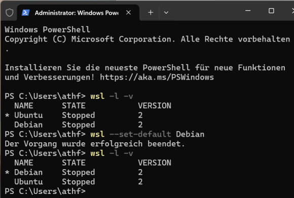 Die Standard-Distribution lässt sich auch ändern. Um zu erfahren, welche es momentan ist, verwenden Sie den Befehl wsl -l -v. Die Standard-Distribution ist mit einem Sternchen markiert. Um nun etwa Debian als neuen Standard einzurichten, der automatisch mit dem Befehl wsl gestartet werden soll, tippen Sie wsl --set-default Debian ein. Die erneute Eingabe von wsl -l -v zeigt, dass die Änderung erfolgreich durchgeführt wurde, Bild 10.