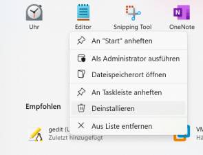 Bei der Integration der Linux-Anwendungen in den Windows-Desktop hat sich Microsoft Mühe gegeben. So tauchen sie nicht nur im Startmenü auf. Sie können sie auch an die Taskleiste anheften und per Copy&Paste mit der Maus Texte markieren und zwischen Windows und Linux übertragen. Selbst zum Deinstallieren einer nicht mehr benötigten Linux-Anwendung genügt ein Rechtsklick auf die Verknüpfung im Startmenü, Bild 14. Ganz so wie bei Windows-Software.