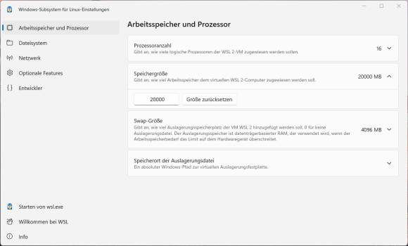 Bild 15: In der WSL Settings-App passen Sie unter anderem den Ihrer WSL-Umgebung zugewiesenen Arbeitsspeicher an