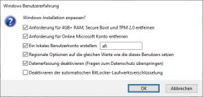 Ein kleines Fenster öffnet sich, in dem Sie die ersten fünf Häkchen setzen, Bild 10. Bestätigen Sie mit OK und warten Sie, bis Rufus die Daten auf den USB-Stick übertragen hat. Wenn Sie Windows 11 anschliessend mit dem USB-Stick installieren, übergeht das Set-up-Programm die Hardware-Anforderungen kurzerhand.