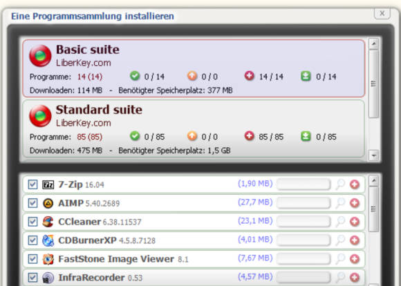 Klicken Sie auf die Schaltfläche Liste verfügbarer Sammlungen herunterladen und wählen Sie entweder Basic Suite, Standard Suite oder Ultimate Suite aus, Bild 8. In der Liste darunter können Sie vorausgewählte Tools auch ausschliessen, indem Sie das Häkchen davor entfernen. Klicken Sie am Schluss auf Alle Programme der ausgewählten Sammlung installieren. LiberKey lädt die ausgewählte Software herunter und richtet sie auf dem Stick ein.