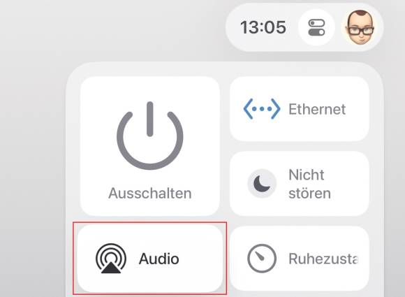 Die AirPods lassen sich automatisch mit dem Apple TV verbinden, wenn beide Geräte beim selben Apple-Account angemeldet sind. Sie werden ausgewählt, indem auf der Siri Remote die TV-Taste rechts unter dem Wählrad etwas länger gedrückt wird. Damit öffnet sich das Kontrollzentrum. Die Wahl des Wiedergabegerätes erfolgt über den Bereich Audio, Bild 1. Alles, was über AirPlay erreichbar ist, gibt sich hier ein Stelldichein: HomePods, aber auch Lautsprecher, Macs und mehr.