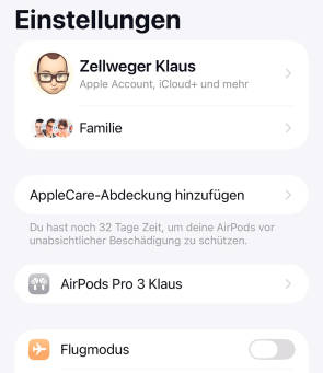 Weil die Möglichkeiten so umfassend sind, empfiehlt sich zuerst ein Blick auf die zahlreichen Einstellungen. Allerdings gibt es dafür keine App. Stattdessen tauchen sie auf der vordersten Seite der iPhone-Einstellungen auf – aber auch nur, wenn sie getragen werden, Bild 1.