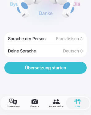 Und dann sind da noch die brandneuen «Live-Übersetzungen»: Sie werden aktiviert, indem beide Stiele gleichzeitig für etwa eine Sekunde gedrückt werden. Die ganze Arbeit schultert dabei das iPhone; die AirPods dienen lediglich der Spracheingabe und -ausgabe. Deshalb funktioniert diese Einrichtung auch mit den AirPods Pro 2 – selbst wenn sich zurzeit nicht verheimlichen lässt, dass diese Einrichtung noch in den Kinderschuhen steckt.