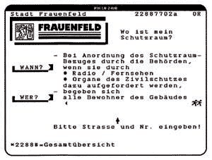 Gemeinsam mit dem Kanton Thurgau und der Stadt realisierte die PTT in Frauenfeld ein Zwei-Wege-Kommunikationssystem für die Schutzraumzuweisung. Das Teilprojekt «Information» wurde mithilfe eines Videotex-Programms realisiert. Am Bildschirm konnte jeder Bürger jederzeit den Standort seines zugewiesenen Schutzplatzes abfragen. In Kriegs- und Katastrophenfällen hätte die Bevölkerung in den Schutzräumen zudem in Kontakt mit der Schutzraumorganisation bleiben können.