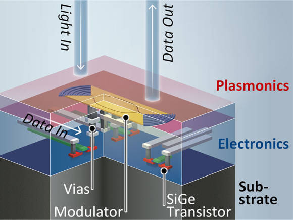 Da die Plasmonik-Chips kleiner sind als elektronische, lassen sich nun tatsächlich viel kompaktere, monolithische Chips herstellen, die sowohl eine Photonik- als auch eine Elektronikschicht umfassen. Um die elektrischen Signale nun in noch schnellere optische umzuwandeln, enthält die photonische Schicht (rot in der Grafik) einen plasmonischen Intensitätsmodulator. Dieser beruht auf Metallstrukturen, die das Licht so kanalisieren, dass man höhere Geschwindigkeiten erzielen kann.