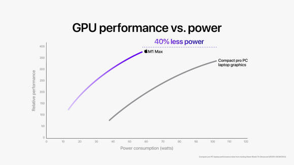 Was Apple an Leistung verspricht, bricht mit der Vorstellung von Notebook-Chips, die oft wegen der Wärmeabgabe und dem Energieverbrauch als Kompromiss betrachtet werden. Die Kurven zeigen den Strombedarf (horizontal) und die Leistung des SoC (vertikal) im Vergleich. Der M1 verbraucht also weniger Strom bei deutlich höherer Leistung – und produziert damit auch weniger Wärme, weniger Lärm und die Batterie hält länger durch.