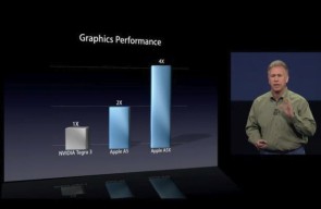 Aufgebohrt wurde hingegen der integrierte Grafikchip, der neu über vier Kerne verfügt. Zusammengefasst hat das Tegra 3 von Nvidia also doppelt so viele CPU-Kerne und dreimal so viele Grafikkerne bei vergleichbaren Taktfrequenzen. Und dennoch soll Apples neuster Streich nach eigenen Angaben viermal so schnell sein in der Grafikleistung?